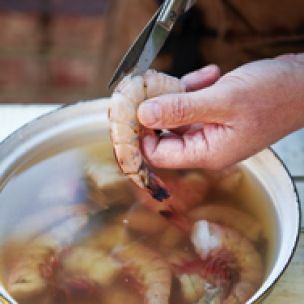 The shell traps the shrimp flavor we all crave and also protects the tender meat, so grill them with the shell on and let folks shell their own shrimp at the table. If you don’t like the look of the dark vein, use kitchen scissors to snip open the shell along the length of the back of the shrimp. Using the tip of a small knife, cut a shallow groove along the length of the vein and lift it out. You have not only gotten rid of the vein, but you will also be able to see a little deeper into the shrimp to know when it’s done.