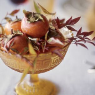 Arrange persimmons, apples, pears, pomegranates or other seasonal ingredients in a decorative dish or bowl. Sprays of fall foliage can be tucked between the fruit for a bountiful feel.