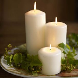 Group clusters of candles on a table runner or plate for a cozy glow. Fill out the centerpiece with greenery and seasonal berries, or even sprigs of herbs.