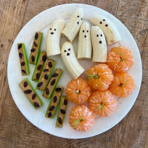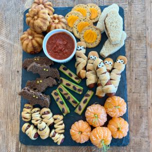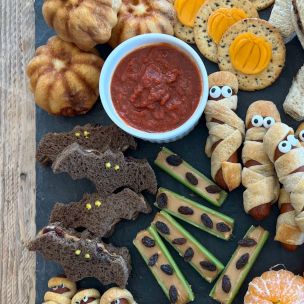 The most central ingredient in your snack board is a healthy amount of creativity. No real recipes required. Make pb&j or ham and cheese sandwiches and use a halloween cookie cutter to cut them into spooky shapes. Fill celery sticks with peanut butter, then top them with raisins for ants on a log. Banana become ghosts with just the right application of chocolate drips. Tangerines transform to halloween pumpkins when peeled and embellished with celery stick "stems." All you really need for the best-ever board is just some good ideas and whole lot of fun.