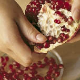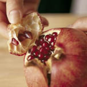 When seeding pomegranates, work over a bowl and wear an apron. Their bright red juices leave stubborn stains on whatever they touch.