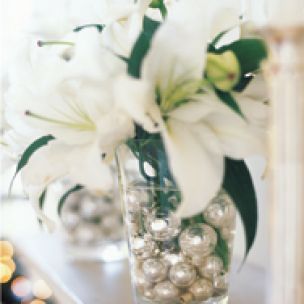 Remarkably simple, these flower arrangements add a glittery and reflective shine to any table or mantel. Add water to a vase filled with ornaments, whose silver loops have been removed. Arrange a few stems within the ornaments.