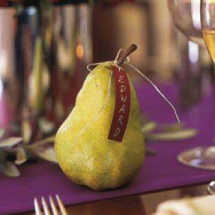Put one of these festive pears, each outfitted with a simple, yet elegant place card, above each guest’s plate.