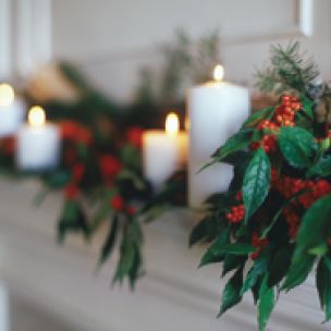 White candles tucked between clusters of red berries and pine boughs illuminate the mantel and cast the room with a welcoming glow.