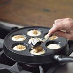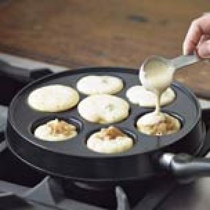 Because the pancakes puff up considerably when cooking, do not overfill the wells with batter.