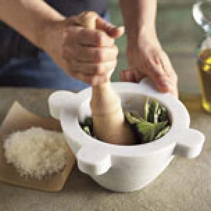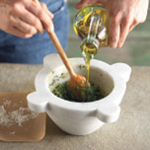 A specialty of Liguria, Italy, pesto is traditionally prepared with a mortar and pestle for maximum taste and ideal texture. The grinding action of the pestle produces a smooth texture and brings out the full flavor of the ingredients.
