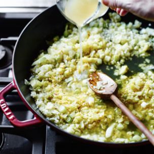 In most paella recipes, you’ll begin by sautéing onions and garlic in olive oil. At that point you will want to stir frequently to keep the ingredients from scorching. However, at a certain point in the recipe, you’ll be instructed not to stir the rice. Heed the warning! Stirring interferes with the formation of the soccarat, the irresistible crispy rice that forms on the bottom of the pan and is the hallmark of a well-made paella. Keep in mind also that, depending on the size of your pan and the configuration of your stovetop, you may need to set the pan over two burners and rotate the pan to evenly distribute the heat.