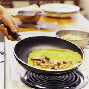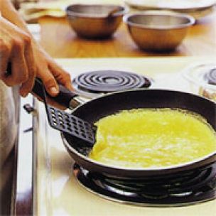 3. Shake and tilt the pan to loosen the omelette, making sure that it slides freely. If it sticks to the pan, use the spatula to loosen it.