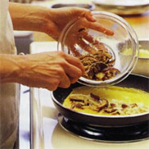 2. When all the egg has set to a custardlike consistency, arrange the filling across the center.