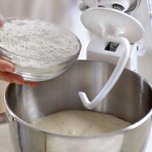 Fit a stand mixer with the hook attachment. Transfer the sponge, if using, to the bowl of the stand mixer. Then, add the flour and any other ingredients called for in the recipe.