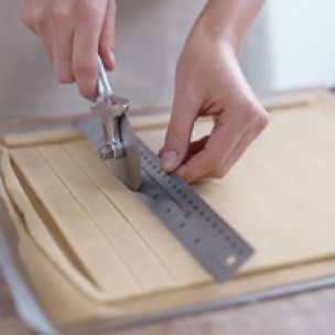 Roll out the dough into a rectangle that is 2 inches longer than the diameter of your pie pan and 1/8 inch thick. Using a pizza wheel or paring knife, trim the edges and cut the rectangle into 10 equal strips.