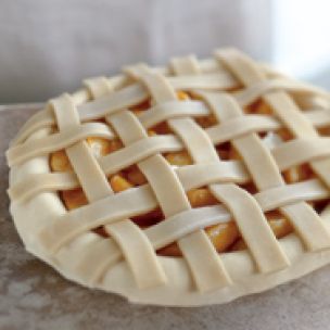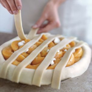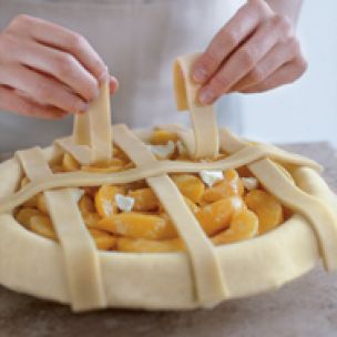 Starting 1 inch from the edge of the pie pan, lay 4 to 6 strips about 1 inch apart over the filling. Use a thin metal spatula to pick up the dough strips gently if they stick to the work surface.