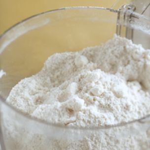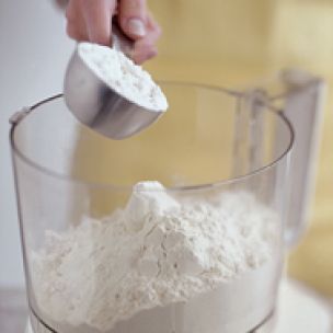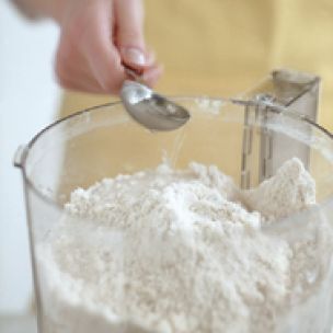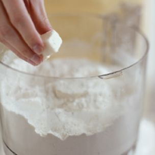 Fit a food processor with the metal blade. Add the flour, sugar and salt to the processor’s work bowl. Pulse the machine 2 or 3 times to mix the ingredients evenly.