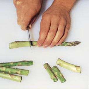 1. Using a small, sharp knife, cut off the woody stem end of each asparagus spear. Alternatively, firmly grasp the end and snap it off; the stalk will break naturally at the proper point.