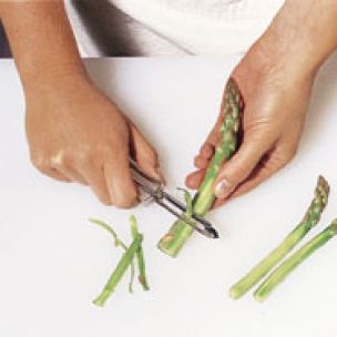The woody stem ends of mature asparagus spears must be removed before cooking. When served whole, all but the pencil-thin spears also require peeling of the tough skin from about mid-spear to the base.