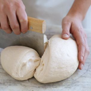 If your recipe calls for dividing the dough into portions, use a bench scraper or a sharp knife to cut it. You can cover the portions of dough you aren’t using with a damp kitchen towel so they won’t dry out.