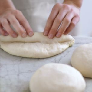 Working with one portion at a time, shape the dough as specified in your recipe. Here, we show the beginning stages of shaping the dough into a baguette. Transfer the finished shaped dough onto a baking pan sprinkled with cornmeal.