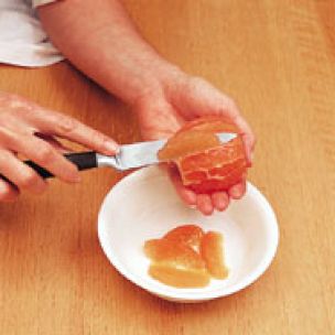 1. Using a sharp knife, cut a thick slice off the top and the bottom of the fruit, exposing the pulp. Hold the fruit upright and slice off the peel in thick strips, cutting around the contours of the fruit.