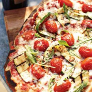 Create a vegetarian pizza: spread the dough with tomato sauce, top with thinly sliced zucchini and whole cherry tomatoes and bake. Then garnish with arugula and enjoy.