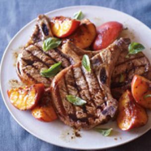 Grilled Pork Chops with Caramelized Peaches and Basil