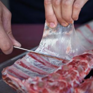 Flip the ribs over so the backside is up. Slide a sharp knife under the corner of the thin membrane that covers the backside of the rack, then grab a corner of the membrane and rip it off (you can also use a paper towel to grab the membrane). The ribs will be easier to eat, will be infused with more flavor, and will cook more evenly.