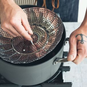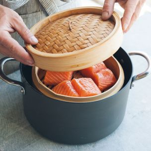 Typically, steaming calls for using a steamer basket, rack or, in the case of Asian-style cooking, a tiered bamboo steamer, all of which help elevate the food above a boiling liquid. Be sure the pot you use has a tight-fitting lid that will accommodate both the food and the rack, as well as hold in the steam as the food is cooking.