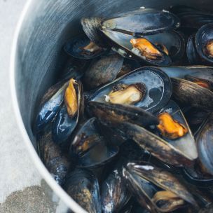 Shellfish come with their own natural “rack” built in. Remove the shellfish from the pot as soon as their shells open. Leave the others in the pan to continue steaming.