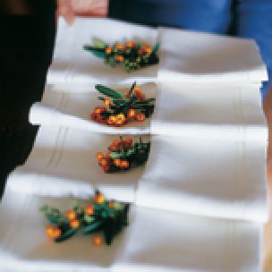 Pocket-folded linen napkins make perfect holders for festive autumnal foliage. For a unified table, add a colorful spray of greenery or a sprig of berries from your centerpiece to tie everything together.