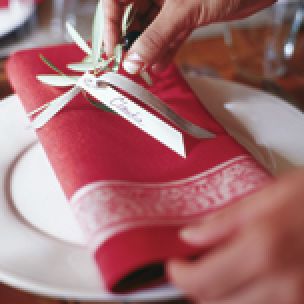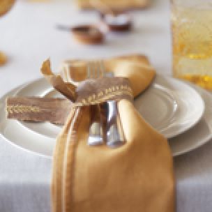 Cut or tear strips of seasonal wrapping paper in shades that complement your napkins. Wrap the strips around the napkins, twisting to secure on the underside. Then slide flatware under the loop and place on or beside each plate.