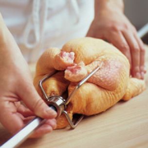 Thread a trussed bird onto the spit through the cavity. Pierce a leg of lamb or roast with the sharp end of the spit and carefully push it through the center of the meat.