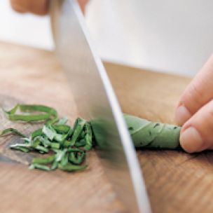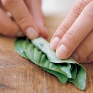 Using a sharp chef’s knife, cut the leaves crosswise into narrow slivers. These ribbons are known as a chiffonade.