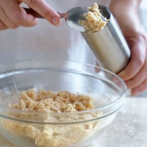Fill the cookie press. Follow the manufacturer’s instructions to fit the cylinder with the cutting disk of your choice (here, a flower shape). Use a spoon to firmly pack the cookie dough into the cylinder of the cookie press, following the markings to determine how much it should be filled.