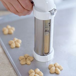 Press out the cookies. Securely attach the handle to the cookie press. Hold the cookie press upright and position it over an ungreased cookie sheet so that it is touching lightly, then press the dough out onto the sheet.