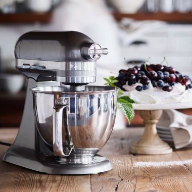 A stand mixer, a stationary, motor-driven electric mixer, is good for combining large amounts of food and heavy batters. The basic set of attachments usually includes one or more stainless-steel or glass work bowls, which lock securely to the case; a wire whisk for beating egg whites or whipping cream; a paddle for creaming butter and sugar and mixing batters; and a dough hook for kneading bread dough. You can extend the versatility of a top-of-the-line model, like a KitchenAid, with a range of accessories that use the motor's powerful action to perform diverse tasks. One popular attachment turns a stand mixer into a high-performance food processor that makes quick work of everyday prep tasks, from slicing potatoes to shredding cheese. A pasta roller attachment simplifies the process of making fresh pasta by freeing up your hand that would be needed to turn the crank on a manual pasta machine, and a pasta press will extrude a variety of pasta shapes using six different plates. One attachment that grinds meat and another that can be used to stuff sausages make preparing homemade sausages a snap. A slow juicer allows you to press fruits and vegetables into fresh, wholesome juices and nut milks, while a citrus juicer attachment makes quick work of juicing lemons, limes and oranges. The grain mill attachment allows you to grind ingredients like wheat, oats and barley into flour. A new spiralizer attachment will turn fruits and vegetables into shapes from slim strands to long, flat ribbons, as well as peel and core several types of produce. The ice cream maker attachment comes with a double-walled metal bowl that can be used to make ice cream after being frozen overnight.