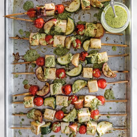 Tofu and Vegetable Kabobs with Roasted Poblano Sauce