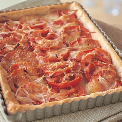 Arrange the tomatoes and shallots evenly over the crust. Season with salt and pepper and top with the cheese. Lightly brush the egg mixture over the edges. Bake until the crust has browned and the cheese has melted, 35 to 45 minutes. Let cool briefly in the pan on a wire rack.