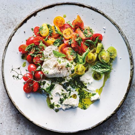 This light salad—a great way of using up leftover pesto in your fridge—is best served in the summer, when tomatoes are at the peak of their season. Adding grilled chicken or cooked and cooled grains, such as farro or couscous, will transform this side dish into the main event.