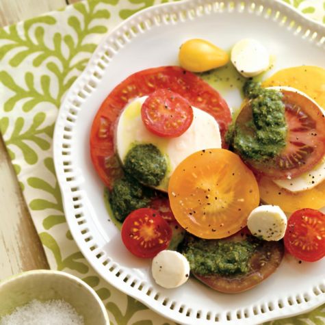 Slice large mozzarella balls 1/4 inch thick and slip between the tomato slices. Or, cut small balls in half and scatter over the tomatoes. Using a small spoon, place dabs of pesto on top of the tomatoes. (If the pesto is very stiff, whisk in a little olive oil to loosen it up.) Grind pepper over the top and serve, passing the remaining pesto at the table. Serves 4 to 6.