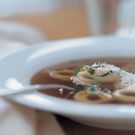 Ladle the tortellini and stock into warmed bowls, garnish with the cheese and basil and serve immediately. Serves 4; makes about 5 quarts stock total.