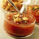 When the weather is hot and the tomato season is at its peak, make a huge batch of this soup. Bread is traditionally incorporated into the soup base (gazpacho means "soaked bread" in Arabic). Here, it is added later, in the form of garlic croutons, preferably warm, for a wonderful contrast of temperatures and textures.
