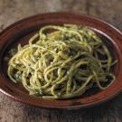 In Liguria, along the coast of Italy right across the border from France, there are as many recipes for pesto as there are cooks. In this recipe we take advantage of the late summer abundance of basil to make a slightly unusual variation on this beguiling green sauce, made with sweet pistachios and sharp, tangy pecorino.