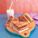 Put 4 picks into the sandwich, placing them in the shape of a cross. Using a sharp knife, cut the stack into 4 triangles. The picks will hold the layers together. Serve immediately. Makes 1 big serving.