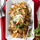 Whether you’re hosting a summer gathering or a game-day watch party, a platter piled high with nachos is a guaranteed crowd-pleaser. In our twist on this fan favorite, we load up thick tortilla chips with tender pork shoulder that’s been slow cooked with Trisha Yearwood’s Peach BBQ Pulled Pork Starter. The Grammy-winning vocalist and culinary show host was inspired by her dad’s legendary BBQ pulled pork. Her sweet-and-smoky sauce combines ripe peaches and tomatoes with tangy mustard, apple cider vinegar and peppery spices. To put the nachos over the top, we ladle on a piquant jalapeño cheese sauce, then garnish everything with a dollop of sour cream, a sprinkling of cotija cheese and fresh and pickled peaches. No doubt about it, these are the ultimate nachos!