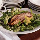In a bowl, whisk together the olive oil, vinegar, pineapple juice, salt and pepper. In a large bowl, toss the watercress and dandelion greens with the vinaigrette. Divide the greens among 4 plates and top each with a chicken breast.
