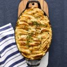 Ordinary potatoes become a sensational side dish when baked in a rich mixture of cream, crème fraîche and nutty Gruyère cheese. Finishing it with a drizzle of truffle oil adds an aromatic touch.