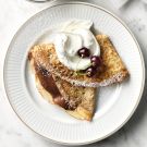 Once the crêpe’s base has turned a light golden color and the batter has solidified, flip the crêpe. It’s up to you how adventurous you are here—you can attempt to throw it in the air (a great party trick, but sometimes disastrous!), or you can simply flip it with a spatula. Let the crêpe cook through, about 2 minutes longer. Serve hot with desired toppings. Repeat until you have used up all the batter, or until the kids are full. Makes 4 to 6 crêpes; serves 4.