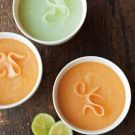 This soup is all about presentation. It will look like it came out of a restaurant kitchen but is surprisingly easy to pull off. To make the melon strips, draw a vegetable peeler over a wedge of peeled melon.