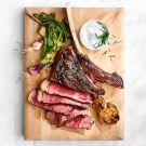 Chef, cookbook author and television host Tyler Florence says this steak is far and away the most popular wow-factor signature dish they serve at Miller & Lux, his modern American steakhouse in San Francisco. The steak has been dry-aged for 45 days and is presented at the restaurant with its giant Flintstones-style bone. Its sheer size is impressive—the chef says three or four people can happily enjoy it for dinner along with a few side dishes. Now you can prepare this dish at home using the recipe from Florence’s new cookbook, American Grill: 125 Recipes for Mastering Live Fire. Because this cut isn’t necessarily one that will be sitting in the butcher counter, you may have to order it ahead of time. If you like, grill some spring onions and a whole head of garlic to serve alongside the steak.
