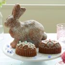 Carefully unmold the bunny cake and place the bunny upright on a platter. If the cake is unstable, use a serrated knife to trim the bottom so it is level. Place the egg cakes alongside. Dust the three cakes with confectioners’ sugar immediately before serving. Serves 12 to 16.