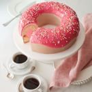 Using a serrated knife, cut off the top of each cake to create a flat surface. Using a spoon, scoop out a trench through the center of each cake about 1 inch (2.5 cm) wide. Transfer the pink buttercream to a pastry bag without a tip and pipe the buttercream into the trench. Using the back of a spoon, push the buttercream into the trench so that it fills up the space. Place one cake half on top of the other cake, cut sides facing in, to form a doughnut shape. Spread a thin layer of the light brown buttercream all over the cake.